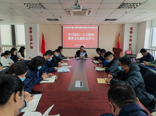 10月28日,菏澤永順工程建設服務有限公司黨支部召開黨員大會傳達學習黨的二十大精神,會議由黨支部書記牛忠建主持,支部全體黨員、團員、中層副職及以上人員參加。