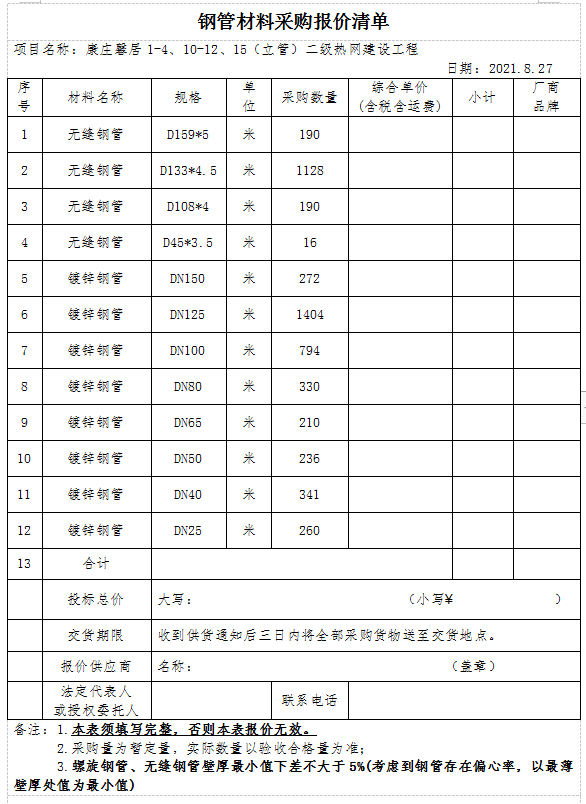 1.材料采購內(nèi)容:康莊馨居1-4、10-12、15(立管)二級(jí)熱網(wǎng)建設(shè)工程用鋼管,具體規(guī)格要求、數(shù)量詳見材料報(bào)價(jià)清單。