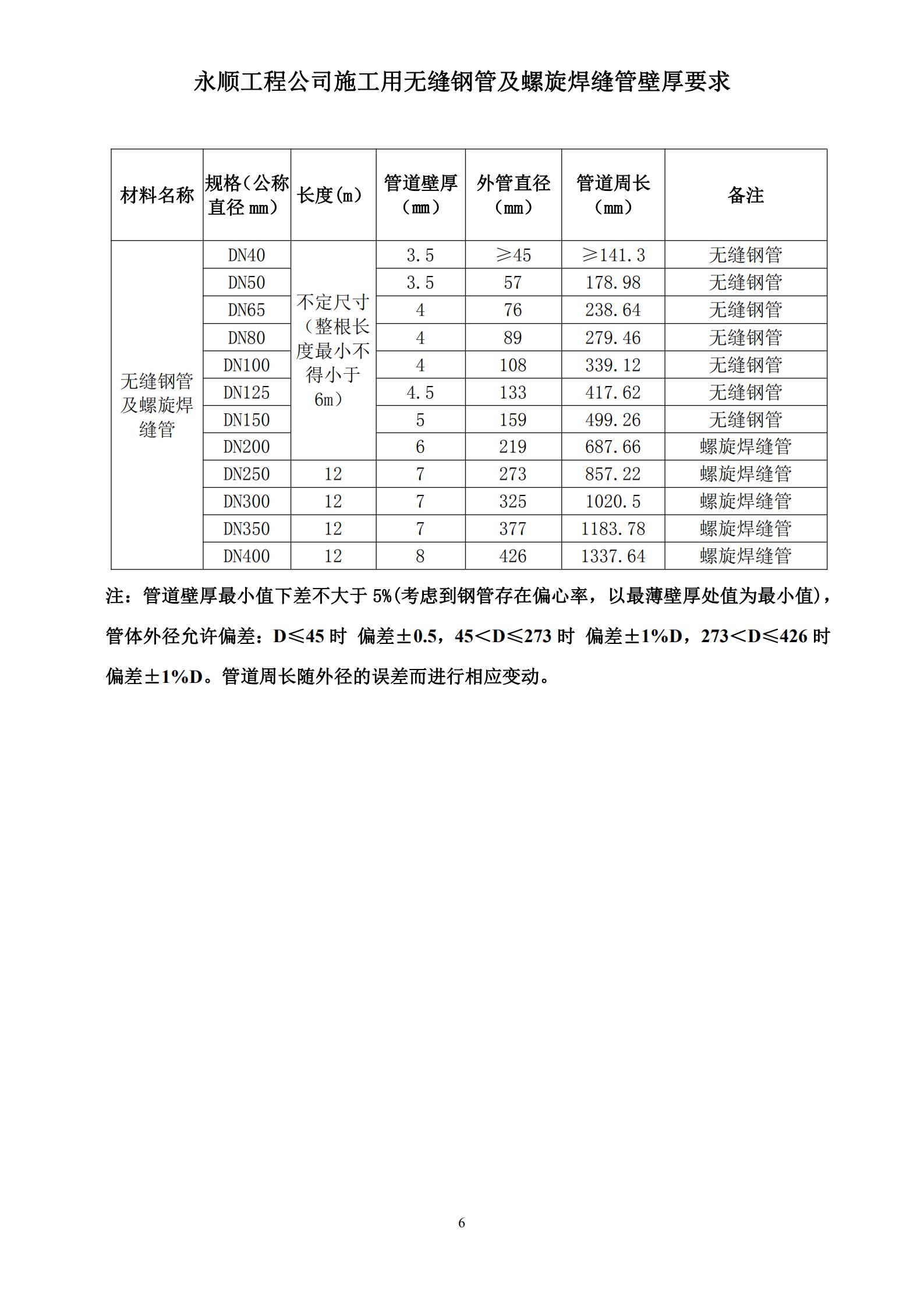 ①無縫鋼管:采取20#鋼,標準為GB/T17395-2008《無縫鋼管尺寸、外形、重量及運行偏差》、GB/8163《輸送流體用無縫鋼管》;螺旋鋼管:材質(zhì)為Q235B,標準為GB/T 9711-2017。無縫鋼管及螺旋鋼管壁厚最小值下差不大于5%,(考慮到鋼管存在偏心率,以最薄壁厚處值為最小值)且不得低于以下企業(yè)標準:上海寶鋼集團公司、首鋼集團、鞍山鋼鐵集團公司、武漢鋼鐵(集團)公司、萊蕪鋼鐵集團、濟南鋼鐵集團總公司、攀枝花鋼鐵(集團)公司、唐山鋼鐵集團有限責任公司、青島鋼鐵控股集團有限責任公司、天津鋼管集團有限公司。