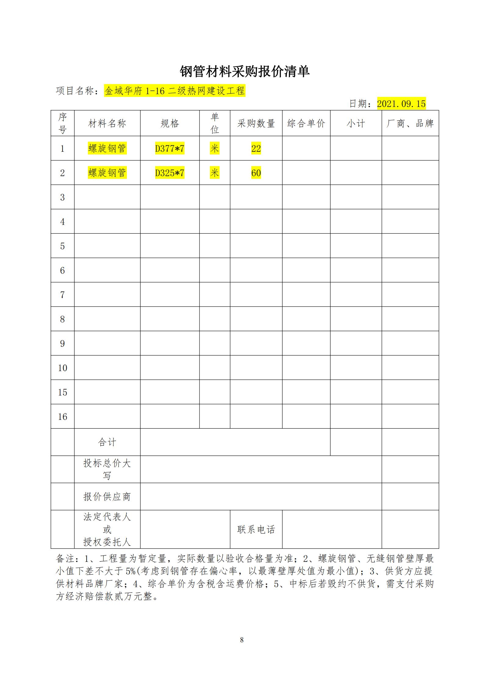 1.材料采購內(nèi)容:金域華府1-16二級熱網(wǎng)建設(shè)工程用鋼管,具體規(guī)格要求、數(shù)量詳見材料報價清單。